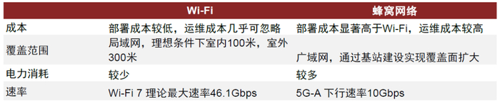 Wi-Fi组网相对灵活便利,节省用户的时间与费用成本。相较于蜂窝网络由运营商巨额投资建设、维护及运营,Wi-Fi支持用户自行组建网络,无需依赖外部运营商的基站建设及繁琐的布线过程,大幅提升了组网灵活性和便捷性。此外,从成本角度来看,蜂窝网络的建设和维护成本高昂,而Wi-Fi则以其较低的硬件成本和简单的配置流程有效节省用户的使用成本。我们认为,Wi-Fi在无漫游需求的场景下具备优势,包括家庭、小型工厂等场景下具身智能体的应用。