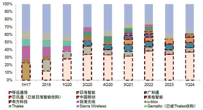 具身智能的端侧对外通信功能主要通过通信模块实现,上游元器件包括基带芯片、射频相关器件(ADC/DAC、滤波器、PA、天线等)、存储芯片等。其中,通信模组位于产业链中游,市场空间跟随蜂窝物联网连接数的提升而扩容,中国厂商在通信模组环节占据大部分的市场份额,根据Counterpoint数据,1Q24全球蜂窝物联网模组出货量同比增长7%,其中移远通信、广和通和中移物联网为全球领先模组厂商,合计占据50%的市场份额。