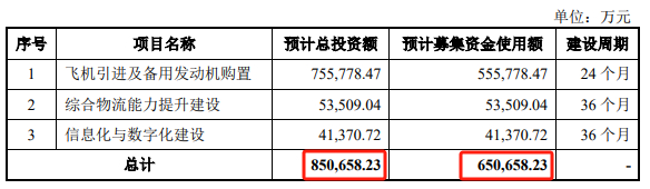 2024年10月,国货航披露了注册稿。在注册稿中,国货航虽然拟募投项目以及预计总投资额未变,但预计融资金额已从上会稿时的65.07亿元降为35亿元。