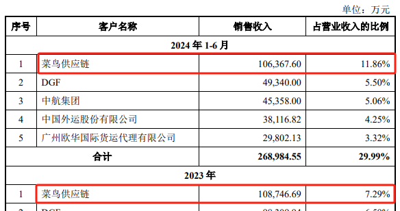 2023年和2024年上半年,浙江菜鸟供应链管理有限公司(下称“菜鸟供应链”)为国货航第一大客户,相关金额分别为10.87亿元和10.64亿元,占国货航营业收入的比例分别为7.29%和11.86%。而此前2019年至2022年,菜鸟供应链连国货航前五大客户都没进。
