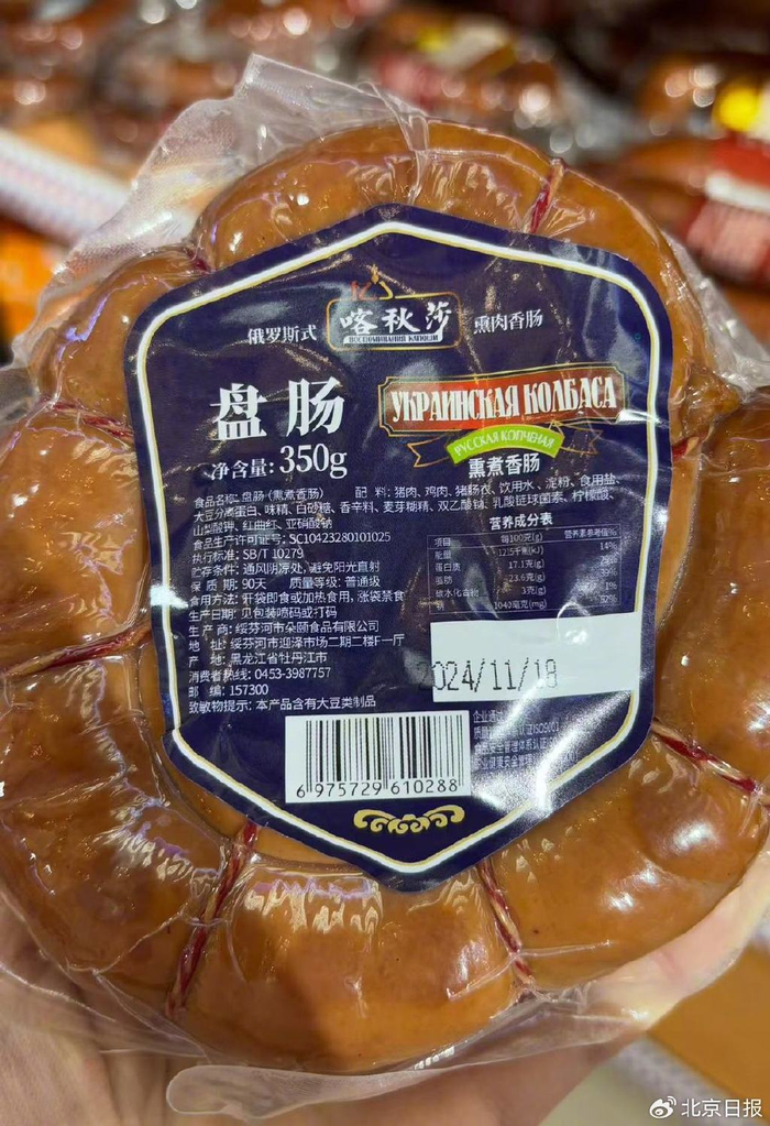 如果说“委托加工”,还多少和俄罗斯沾点边儿,肉制品货架上,一款“喀秋莎”盘肠,则是连外文包装也没有,直接以中文注明,生产商是绥芬河一家食品公司,产地为黑龙江省牡丹江市。但货架上安插的价格标签却写明,其产地为俄罗斯。
