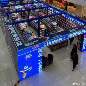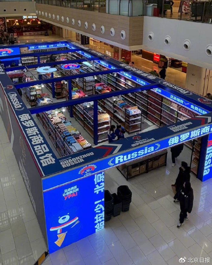 “Russia”“哈拉少!”在南六环附近的一家商场B1层,位于中庭区域的“俄罗斯商品馆”十分醒目。蓝色为主基调的墙面上,白色粗体标识极富冲击力,远远就能吸引人们的目光。