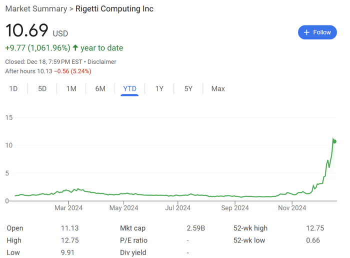 分析师指出,自从谷歌母公司Alphabet在12月9日宣布其在量子计算领域取得突破性进展后,量子计算已经成为交易员们的“新宠”。像Rigetti Computing、Quantum Computing这样的较小的、纯粹的量子计算公司,今年以来股价飙升,Rigetti Computing已涨超1000%。
