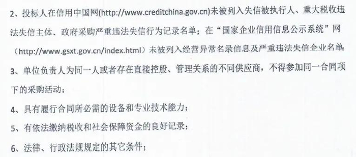 3.1.2 信誉要求:被最高人民法院在“信用中国”网站(www.creditchina.gov.cn)中列入失信被执行人名单的投标人不得投标。被工商行政管理机关在全国企业信用信息公示系统中列入严重违法失信企业名单的投标人不得投标。