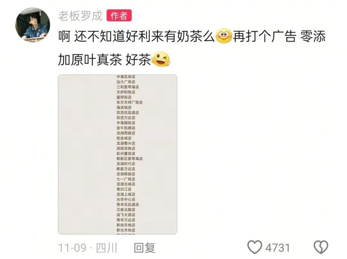 罗成还在丁佳敏、石展承的评论区甩上一张好利来奶茶全国门店分布图,并评论“再打个广告,零添加原野真茶好茶”。