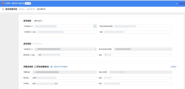 点击【确定】,进入发票填开界面,纳税人填入实际发生业务的买方信息、卖方信息,确认开票方信息。