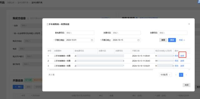 在弹出的界面中,选择本次换开增值税专用发票所关联的二手车销售统一发票,在右侧点击“选择”。