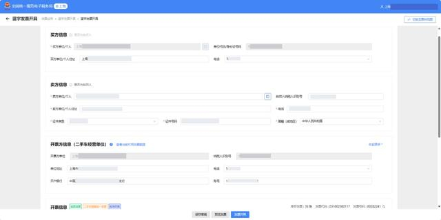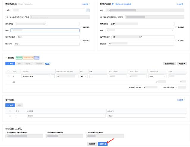 进入开票信息界面,系统将根据关联的车辆识别代码/车架号码自动带入厂牌型号等二手车销售统一发票信息,确认信息后,点击【发票开具】。