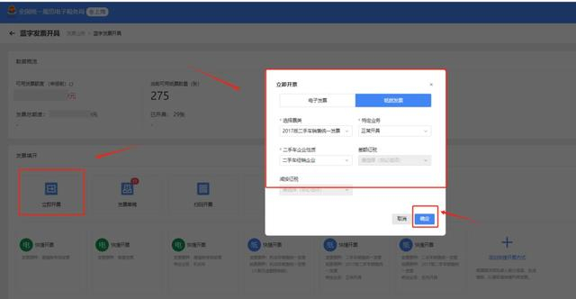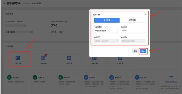 点击【立即开票】,发票类型选择“增值税专用发票”,特定业务选择“二手车”,点击【确定】。若选择普通发票,操作与专票一致。
