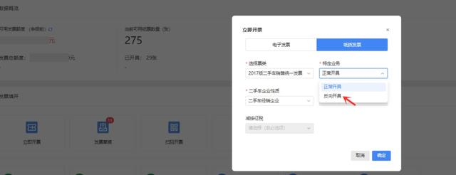 若二手车企业性质为经销企业,特定业务下拉列表增加“反向开具”选项。