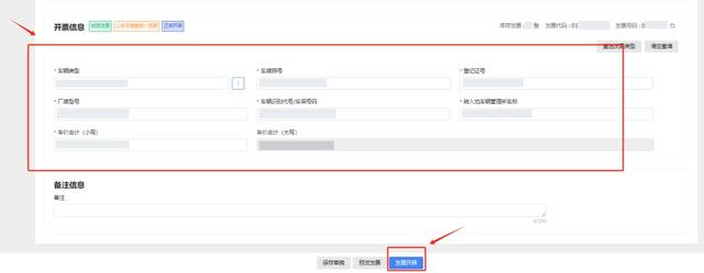 在页面下方的“开票信息”中,录入车辆类型、车牌照号、登记证号、厂牌型号、车辆识别代码/车架号码、转入地车辆管理所名称、车价合计,内容确认无误后,点击【发票开具】,开具成功。