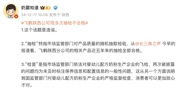 同时,母婴育儿博主、微博大V“奶霸知道”向网友科普,抽检和检查并非一回事。“‘抽检’特指市场监管部门对产品质量的随机抽取检验,从报道看,飞鹤陕西分公司的相关产品近五年来的抽检全部合格。‘检查’是指市场监管部门依法对婴幼儿配方奶粉生产企业的飞检,两次被披露的问题均为未及时标注保养信息和配置信息的一般性问题,这从另一个方面说明我国监管部门对婴幼儿配方奶粉生产企业的严格监督检查,消费者可以更加放心才对。”
