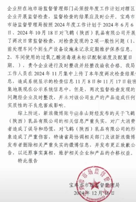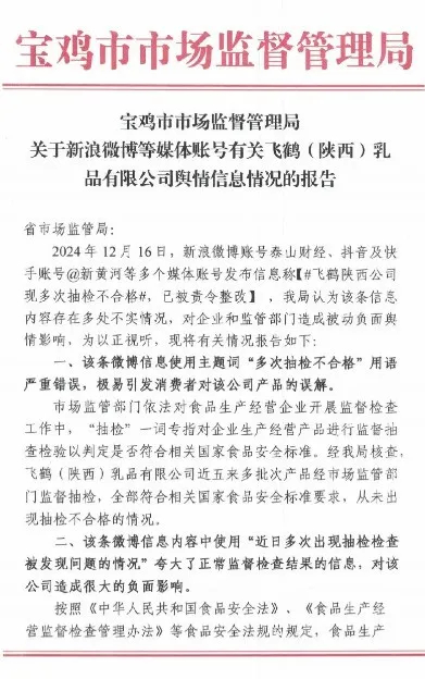 12月16日,陕西省宝鸡市市场监督管理局发布关于新浪微博等媒体账号有关飞鹤(陕西)乳品有限公司舆情信息情况的报告。报告提到,针对近期的网络传闻,“近日多次出现抽检被发现问题的情况”夸大了正常监督检查结果的信息,对该公司造成很大的负面影响。并且,抽检发现的两项一般性问题为“前处理车间个别生产设备设施未记录定期维护保养信息”“车间使用的过氧乙酸消毒液未标识配制浓度及配置日期”。