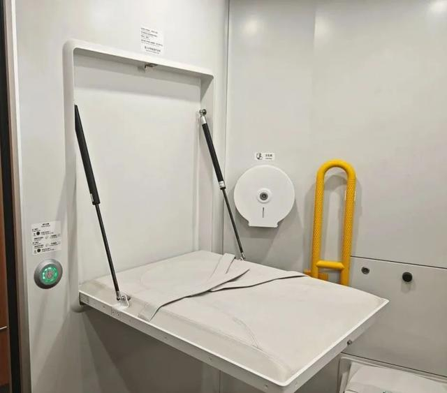 列车中部的无障碍卫生间设有婴儿护理台,方便旅客为小宝宝更换尿布。