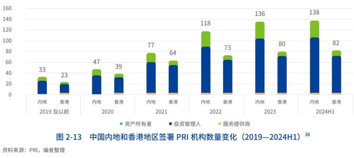 近年来,中国内地和香港地区签署PRI的机构数量保持增长。截至2024年二季度末,中国内地共有138家PRI签署方,包括3家资产所有者,101家投资管理人和34家服务提供商;中国香港则有87家PRI,包括3家资产所有者,72家投资管理人和7家服务提供商。