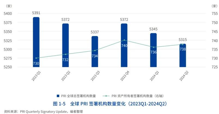 受“反 ESG”运动影响,以及政策端和市场端的多重压力,自2023年二季度开始,PRI的签署方数量出现波动下降的趋势。