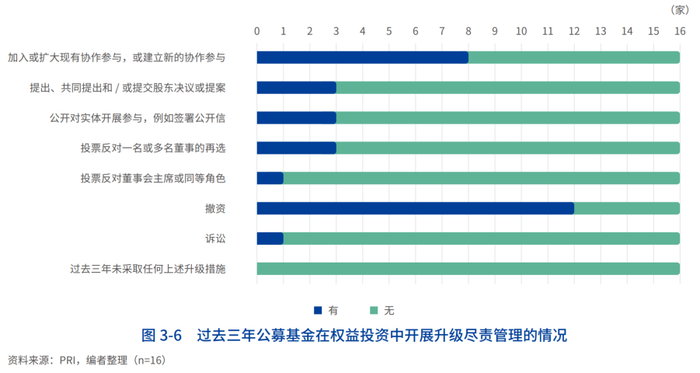 → 多数公募基金倾向于开展协作尽责管理。16家公募基金中有13家(占81.3%)表示通常会优先开展协作尽责管理。当与被投公司沟通不顺、效果有限时,投资者可能会选择采取升级措施(escalation),运用更强硬的措施给投资对象施加影响。其中,撤资、降低敞口、不投资等“用脚投票”的方式是公募基金在尽责管理中较为常用的升级措施。