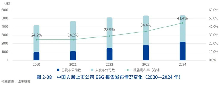 截至2024年三季度末,A股上市公司中共有2220家上市公司发布了上一年度的ESG报告,占比41.4%,比上一年增加386家、报告发布率提升7.0个百分点