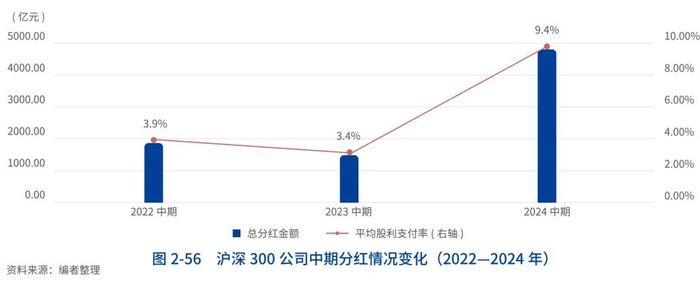 • 截至2024年三季度末,沪深300公司中共有89家披露了中期分红预案,合计分红金额达4821.94亿元,同比提高202.8%;股利支付率9.4%,同比提高1.76倍。