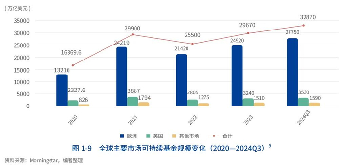 截至 2024 年三季度末,全球可持续基金规模接近 3.3 万亿美元,处于历史最高水平。全球股市自 2023 年以来的有力反弹,是促成可持续基金规模回升的重要条件之一。