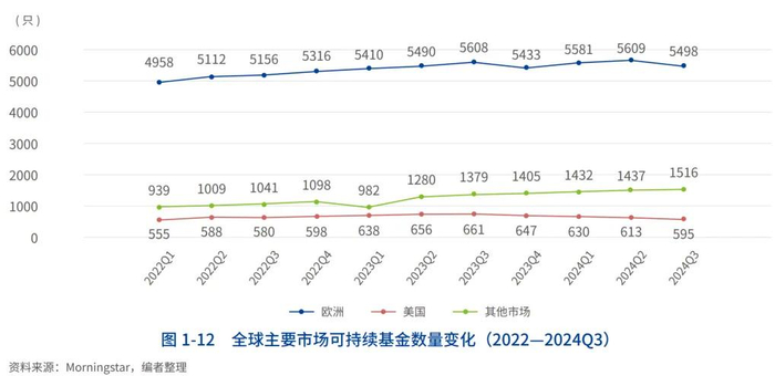 2022 年以来,全球可持续基金的数量整体保持增加态势。到 2024 年三季度末,全球已有超过 7600 只可持续基金,其中欧洲市场占七成以上。