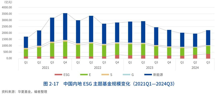 截至2024年三季度末,内地市场累计成立ESG主题基金296只,总规模为2235.41亿元,较二季度末上升14.8%,遏制了2023年三季度以来连续四个季度的下滑趋势,总规模恢复到了2023年末的水平。