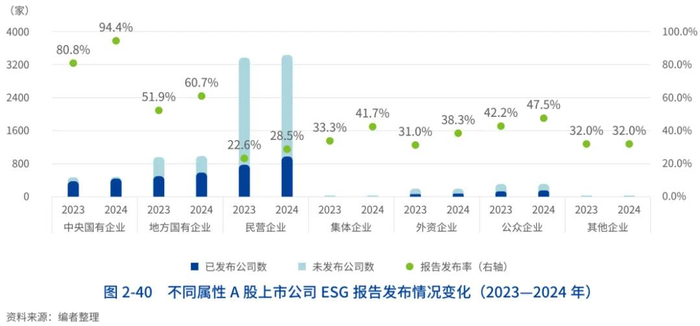 中央国企积极响应国资委相关政策要求,ESG报告发布率达到94.4%,显著高于其他所有制企业;地方国企的报告发布率位列第二,为60.7%