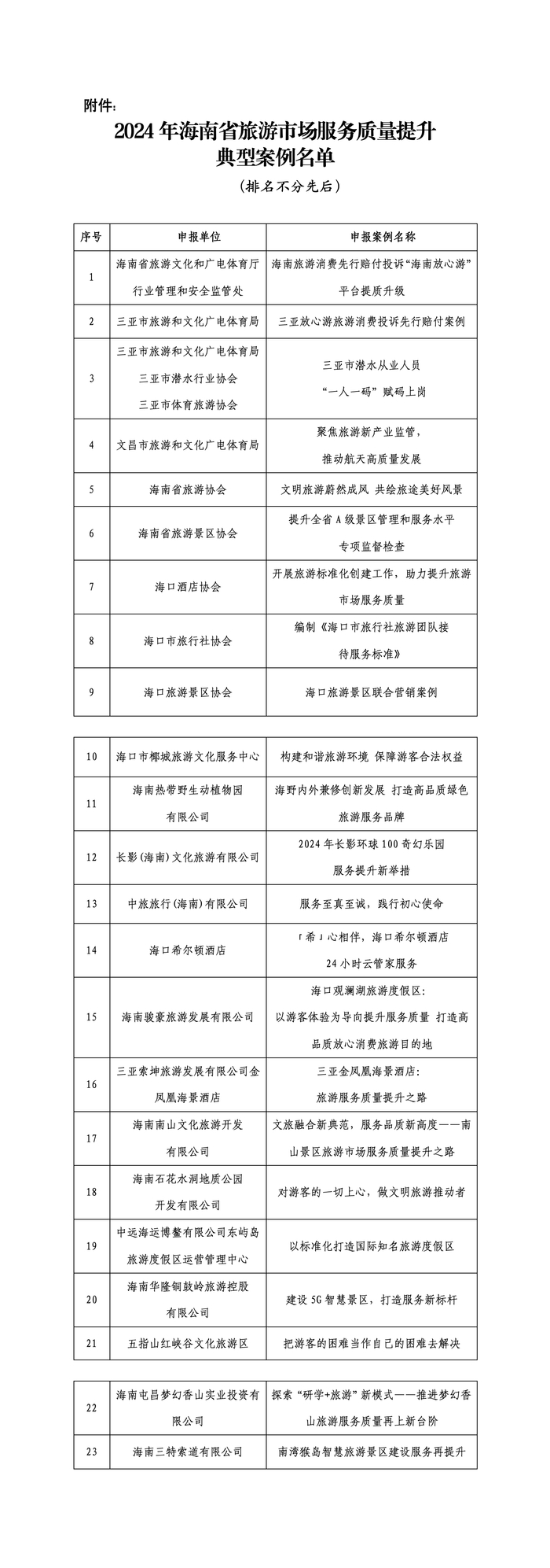 据悉,为总结提炼旅游服务质量提升的成功经验,推动全省旅文行业服务质量提质增效,2024年海南省旅游市场服务质量提升典型案例征集工作于今年7月启动,经专家评审等环节,在全省旅文行业范围内共评选出23个典型案例,涵盖旅游服务质量监管提升、智慧旅游服务提升、旅游服务品牌提升、旅游服务体验优化提升、暖心服务保障提升等内容,多方面呈现全省旅游服务质量提升的工作亮点。