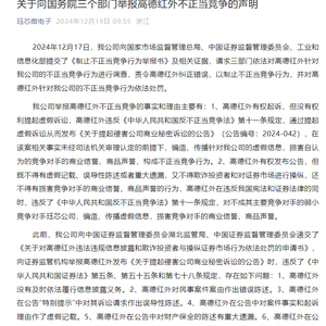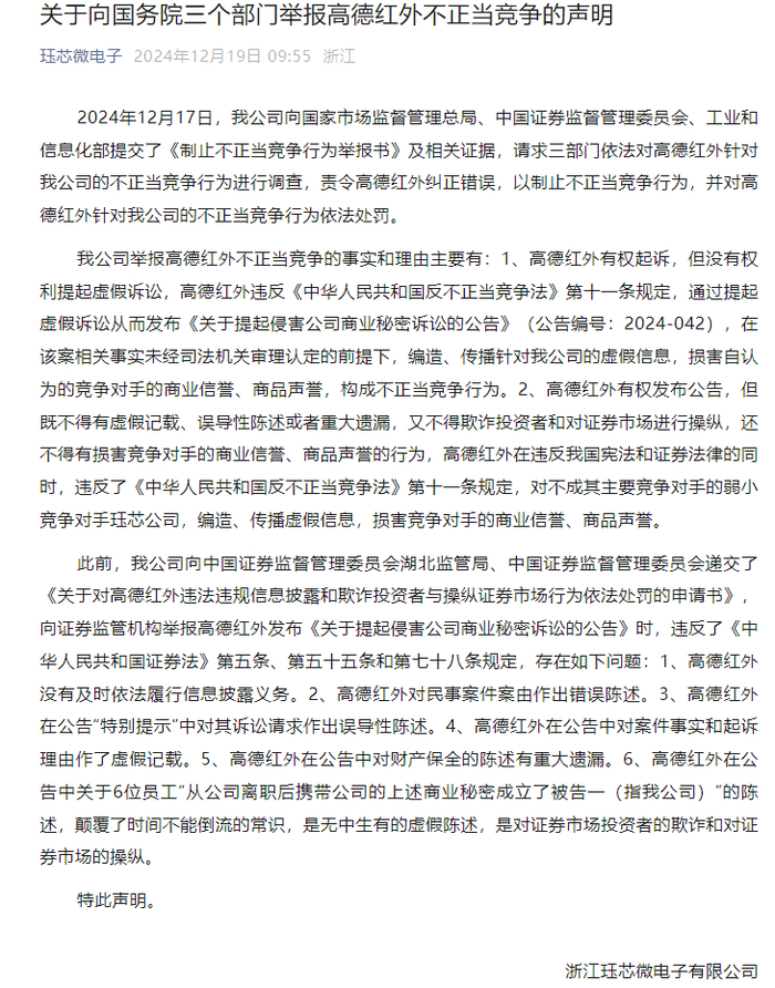 具体来看,据“珏芯微电子”公众号12月19日上午消息,2024年12月17日,公司向国家市场监督管理总局、中国证券监督管理委员会、工业和信息化部提交了《制止不正当竞争行为举报书》及相关证据,请求三部门依法对高德红外针对公司的不正当竞争行为进行调查,责令高德红外纠正错误,以制止不正当竞争行为,并对高德红外针对公司的不正当竞争行为依法处罚。