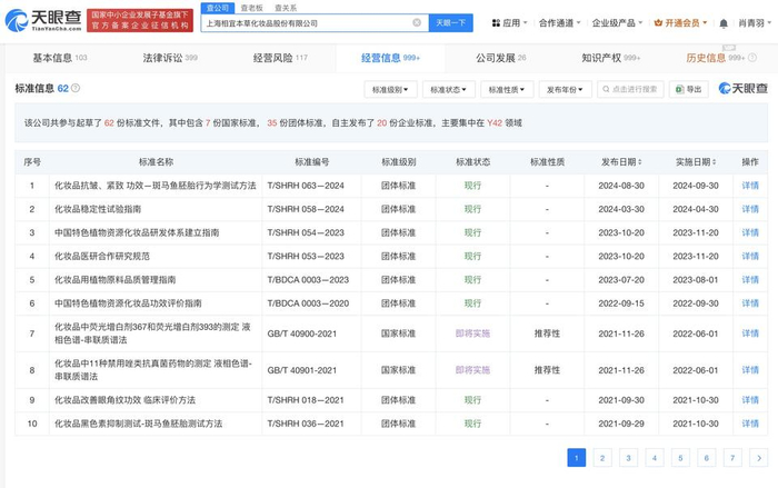 天眼查App显示,上海相宜本草化妆品股份有限公司成立于2000年3月,法定代表人为封帅,注册资本约3.5亿人民币,经营范围含日用化学品、香料的零售、批发、进出口、佣金代理及相关配套服务等,由封帅、CAPITAL TODAY INVESTMENT X (HK) LIMITED等共同持股。对外投资信息显示,该公司持有7家企业股份,其中5家为存续状态,包括上海相宜荟生活健康科技有限公司、上海相宜云商电子商务有限公司等,版图涉及电子商务、实业、科技等领域。标准信息显示,该公司曾参与起草了多份标准文件,包括“化妆品中荧光增白剂367和荧光增白剂393的测定 液相色谱-串联质谱法”、“化妆品中11种禁用唑类抗真菌药物的测定 液相色谱-串联质谱法”、“化妆品中限用防腐剂二甲基噁唑烷、7-乙基双环噁唑烷和5-溴-5-硝基-1,3-二噁烷的测定”“化妆品中禁用物质马兜铃酸A的测定 高效液相色谱法”等标准。