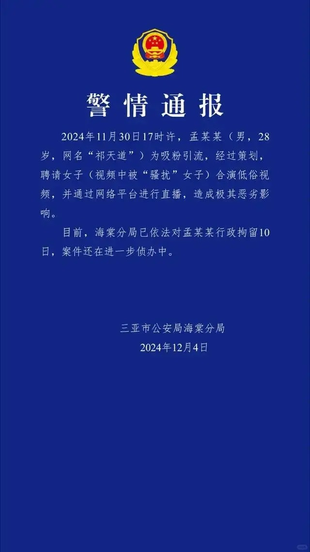 在2024年11月30日17时许,有一名男子孟某某,年龄为28岁,其网名叫做“祁天道”。他为了达到吸引粉丝、增加流量的目的,经过精心的策划和安排,专门聘请了一名女子,也就是在视频中看似被“骚扰”的女子,二人合演了一段低俗视频。