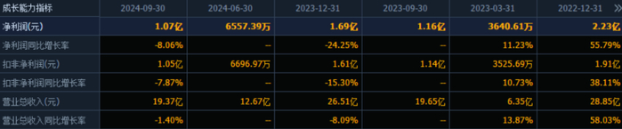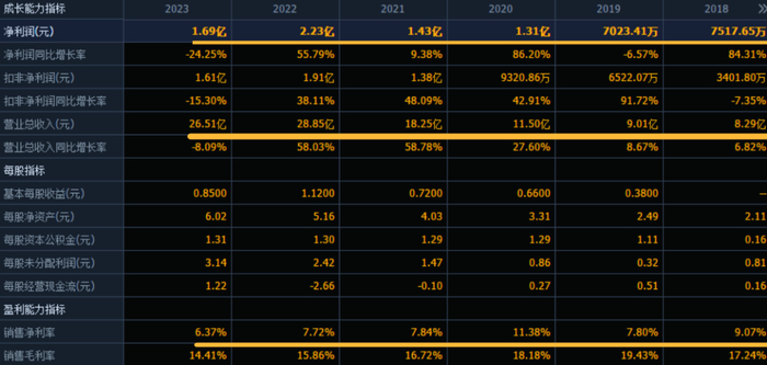 公司 2021-2023年分别实现营业收入18.25亿元/28.85亿元/26.51亿元,增长率依次为58.78%/58.03%/-8.09%;实现归母净利润1.43亿元/2.23亿元/1.69亿元,增长率依次为9.38%/55.79%/-24.25%。最新报告期,公司2024年1-9月实现营业收入 19.37 亿元、同比下降1.40%,实现归母净利润1.07 亿元、同比下降 8.06%。