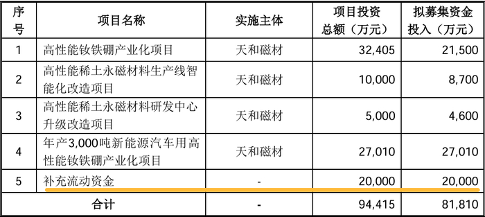 本次拟募集资金8.18亿,其中2.15亿投入高性能钕铁硼产业化项目,0.87亿投入高性能稀土永磁材料生产线智 能化改造项目,0.46亿用于高性能稀土永磁材料研发中心 升级改造项目,2.7亿用于年产3,000吨新能源汽车用高 性能钕铁硼产业化项目,2亿用于补充流动资金。具体项目如下: