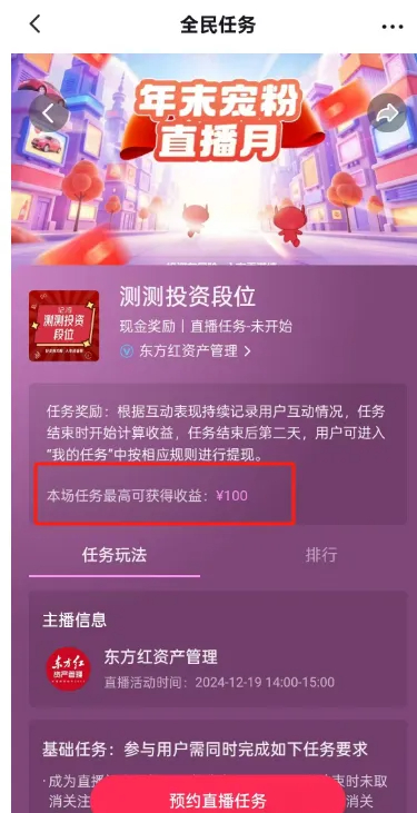 不仅视频搞“全民任务”,东方红资管马上又要搞直播的“全民任务”。打出的广告显示,一场任务一个用户可最多赚米100。