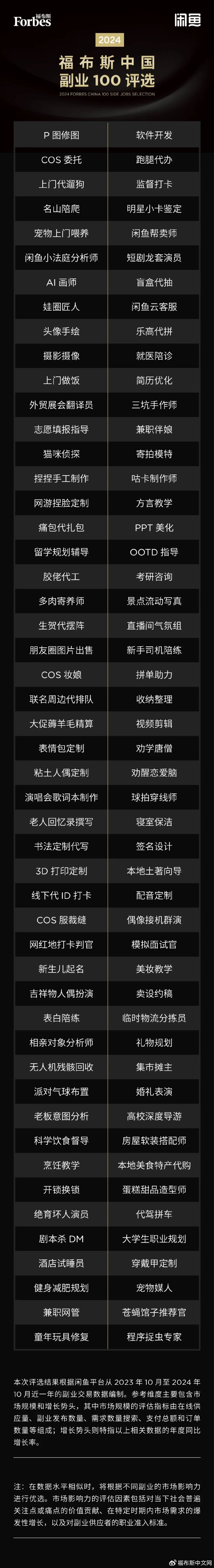 更重要的是,副业作为人生的“第二曲线”,其热门业务不仅能够体现先进技术的发展,还能反映当代年轻人价值观的转变与生活方式的选择。在此背景下,福布斯中国基于闲鱼上的副业人群洞察与相关平台数据增长,发现从商品到个体的闲暇价值的延续,发布“2024 福布斯中国副业100评选”,愿助力更多仍在探索「Plan B」的人群,寻找到更契合自身的副业发展方向,实现个人价值与经济收益双丰收。