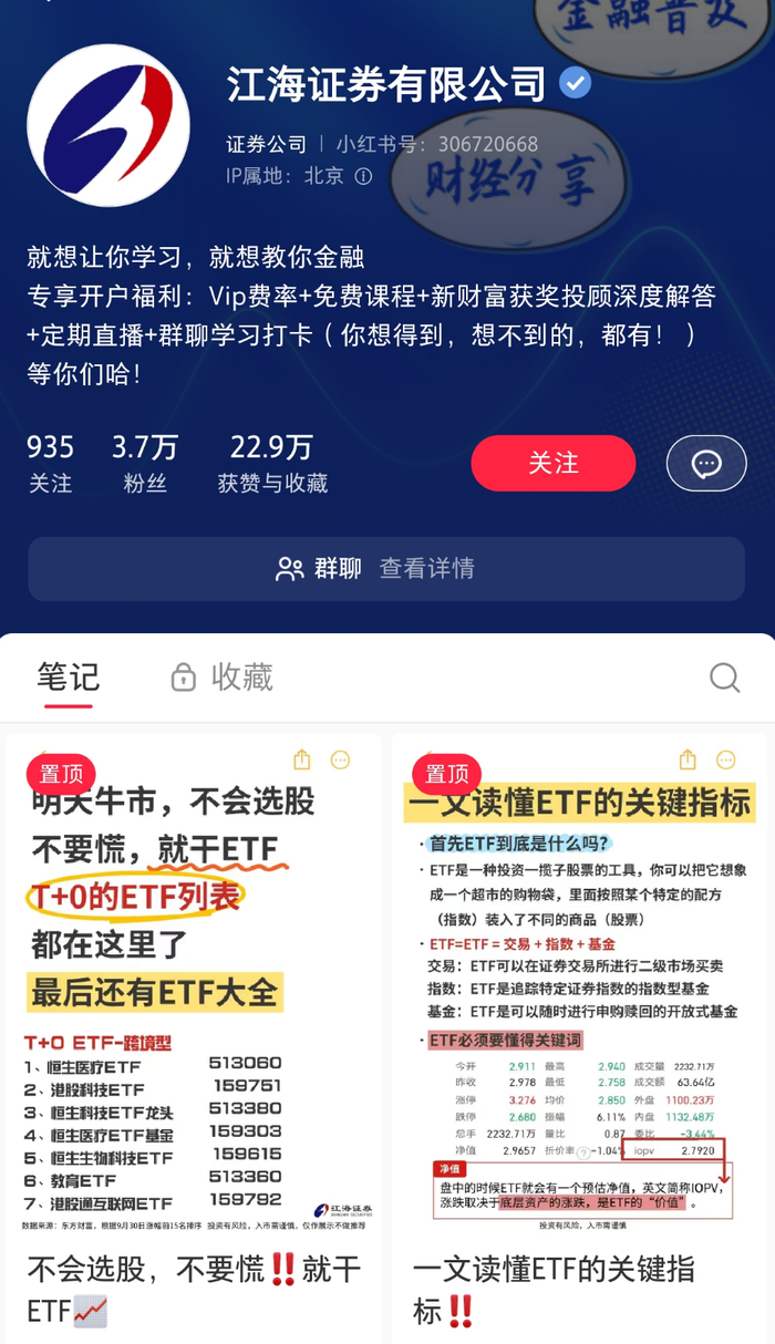 此外,江海证券深化自媒体N+1矩阵建设,优化全流域运营闭环。其中,江海证券重点打造小红书官方账号,目前已经吸引粉丝关注3.7万,实现全平台券商行业第一名。