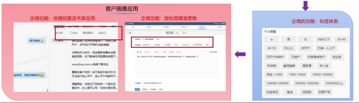 具体而言,“三画像”是指:客户画像、产品画像、员工画像;“一智能”是指智能营销,是通过对用户、产品、员工的匹配,实现精准营销。在整个营销裂变的链路中,不断通过智能客服、企业微信等系统工具实现链路优化,以及通过时间维度、事件维度、资产维度、场景维度等场景搭建,锚定精准客群,并通过IT资讯、服务等智能工具实现专属的服务、营销触达,提升客户营销效率。