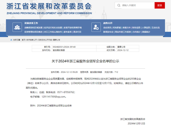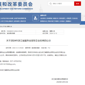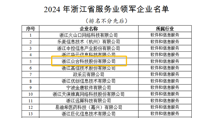 近日,浙江省发展和改革委员会发布《关于2024年浙江省服务业领军企业名单的公示》,浙江众合科技股份有限公司在“软件和信息服务”门类光荣上榜,展现了公司涵盖主营业务收入、企业影响力、商业模式和经营业态等多个维度的卓越竞争力。