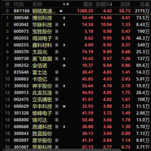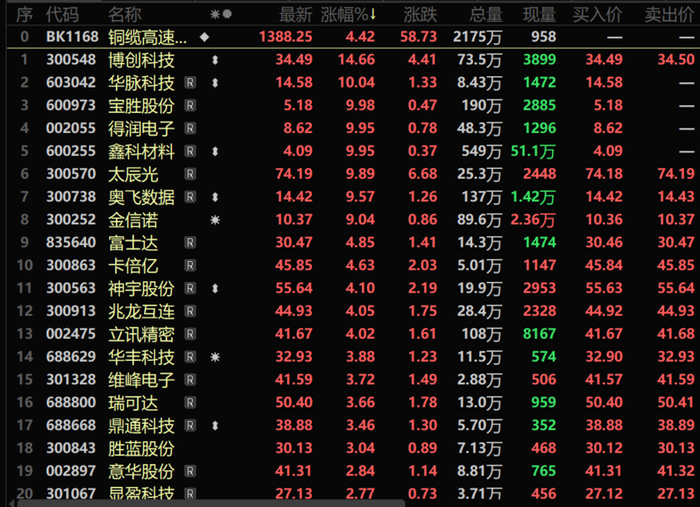 随着人工智能的发展,海南省加速布局智算产业,以及字节跳动和豆包大模型于上海举行“FORCE2024原动力大会”使得市场热议AI工具豆包,而与其相关的AI应用诸如算力概念股出现了逆势的上涨,而市场对算力概念预期抬升以后,也带动了相关的铜缆高速连接概念股连续两日逆势拉升,铜缆高速连接概念指数更是在12月19日录得了4.42%的涨幅,截至19日日间行情收盘,铜缆高速连接多只个股出现大幅上涨,其中:华脉科技、宝胜股份、得润电子、鑫科材料等涨停,博创科技涨14.66%。太辰光、奥飞数据、金信诺等均涨超9%。