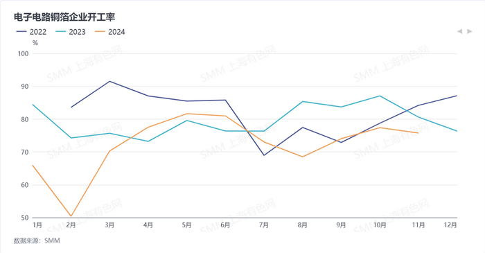 据SMM调研,2024年11月铜箔企业的开工率75.48%,环比下降0.13个百分点,同比下降2.32个百分点。具体到不同领域,电子电路铜箔的开工率为75.75%,环比减少1.62个百分点,同比减少4.85个百分点。11月国内铜箔企业整体开工水平微幅下滑,但仍处年内高位。一方面在以旧换新等政策的刺激下,终端需求表现良好;另一方面,由于12月我国铜箔及覆铜板出口退税取消、锂离子电池出口退税下调,11月有集中赶出口订单的情况。但企业整体开工率有所走低,主要是受到了铜价重心下移的影响。具体来看,11月锂电铜箔开工率小幅上涨,动力端在政策的推动下,终端车企年末冲量,需求延续火热表现;在储能端口,伴随年终并网节点临近,下游采购积极。电子电路铜箔开工率则有所下降,但终端的汽车与高端服务器行业订单表现相对较好。》点击查看详情