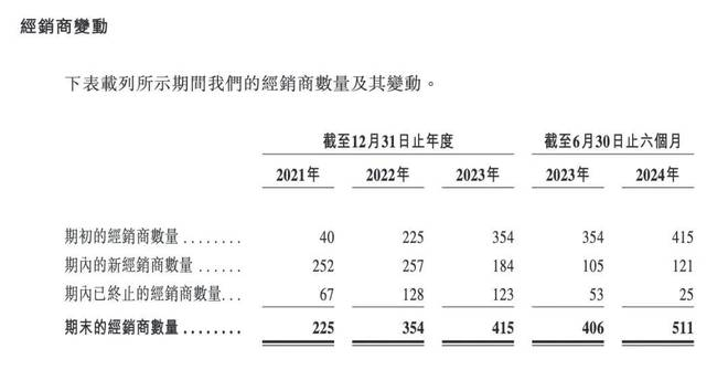 2022年末、2023年末以及2024年上半年末,该公司的经销商数量分别为354家、415家和511家。