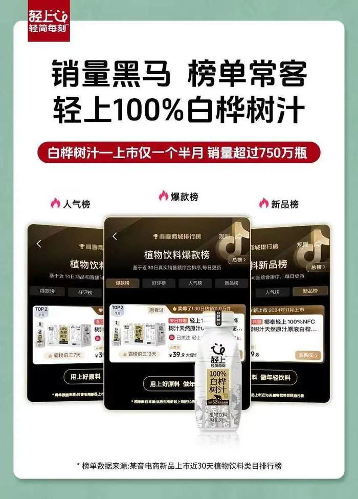 二是做性价比产品,比如轻上、超吉椰、白桦小镇等品牌。轻上规格为4元/245ml的100%白桦树汁,售价仅为4元,上线短短一个多月就售出了750万瓶。超吉椰旗下的超吉年桦则推出5元/245ml和8元/两款新品360ml,在零食量贩、 连锁便利、社区便利、会所特通、校园店等线下渠道进行布局。