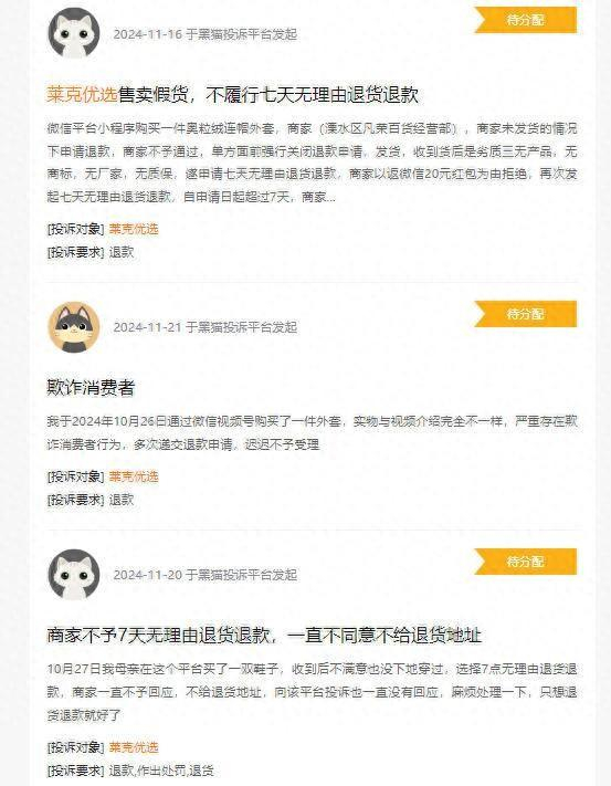 记者进一步调查发现,市民王先生的遭遇并非个例。不久前,本报【有事找紫牛】栏目就曾报道,有消费者遭遇相同骗局,连衣物包装显示的销售公司都是一致的。在黑猫投诉平台,有大量与“莱克优选”相关的投诉,且具有两点共性,一是投诉内容均为“衣物货不对板”且无法退货退款,二是消费者的下单时间大多集中在10月26日至29日之间。