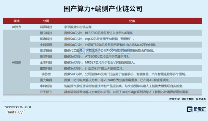 其次,在AI应用落地成为主要叙事方向的情况下,零部件供应链企业也将受益于终端产品销量快速增长。其中,最主要的价值增量来自系统集成芯片SOC的迭代,必然要去适配端侧模型的算力需求。譬如可穿戴赛道,原来的数字芯片要求快速连接和低功耗,而未来的重点方向将是多模态处理能力,例如AR眼镜的视觉处理能力。国内部署端侧芯片的厂商能否取得突破,也值得关注。