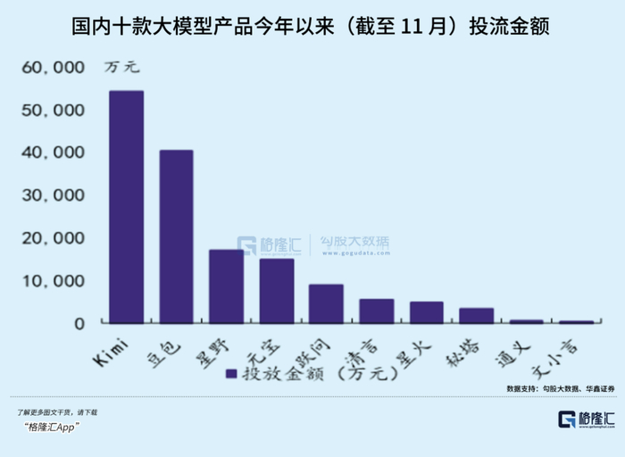 其次从买量也可见一斑,报道称,截至11月,旗下豆包产品的投放花了4个亿左右,仅次于Kimi的5.4亿。