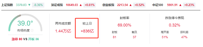 创业板指放量反弹0.52%、沪指跌0.36% AI产业链集体爆发。三大指数全天低开高走,收盘涨跌不一。截至收盘,沪指下跌0.36%,深证成指涨0.61%,创业板指涨0.52%。两市个股跌多涨少,下跌个股2800只;两市全天成交1.44万亿元,较上一日放量成交836亿元,内资主力资金净卖出232.8亿元;两市涨跌中位数为-0.13%。