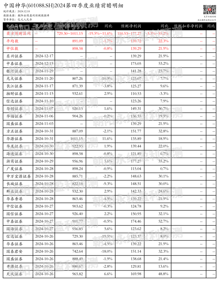 季度业绩前瞻 | 中国神华:业绩增长,分红价值凸显,预测四季度营收729.30~1011.15亿元,同比-19.5%~11.6%