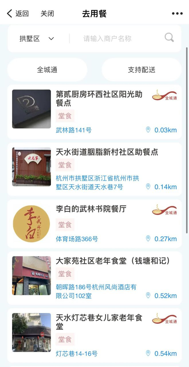 橙柿直通车了解到,上城区有南星街道惠民老年食堂、“益食堂”水澄桥社区助餐点等老年食堂,为辖区内的老年人提供配餐服务。同时,老年人可以在“浙里办”App的“杭向颐养”服务中选择“去用餐”服务,即可查询到身边的“全城通”老年食堂,地址、联系方式、营业时间等一目了然,并按距离远近推送相关信息,方便老年人和家属选择。