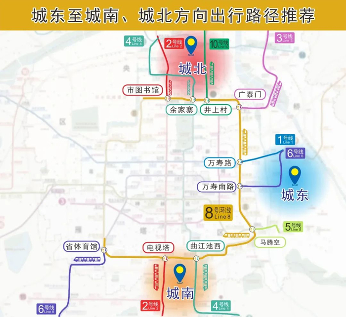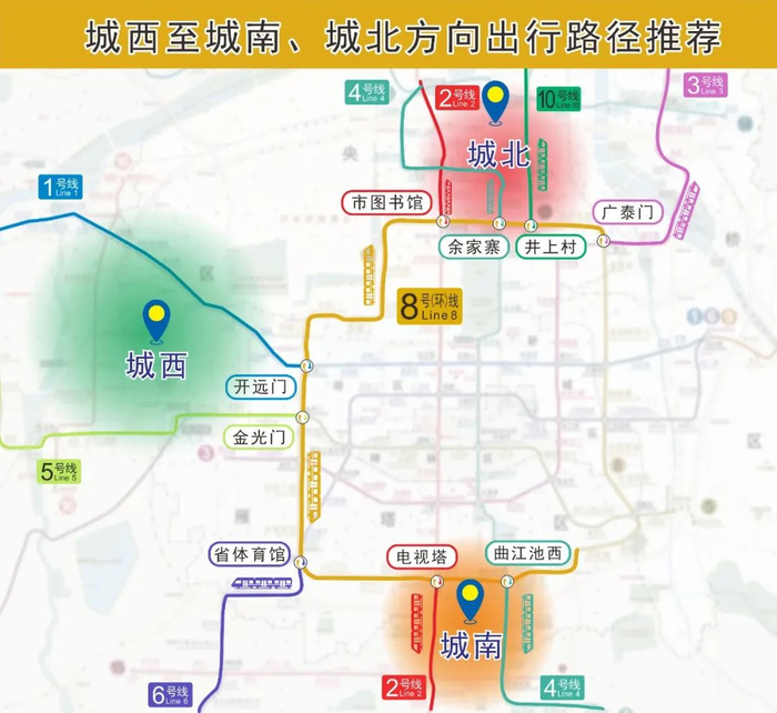 三是城南至城东、城西方向出行路径推荐:以前由城南方向经2号线北大街站、4号线五路口站换乘至城东、城西方向的市民,现在可选择在2号线电视塔站或4号线曲江池西站换乘8号(环)线前往。