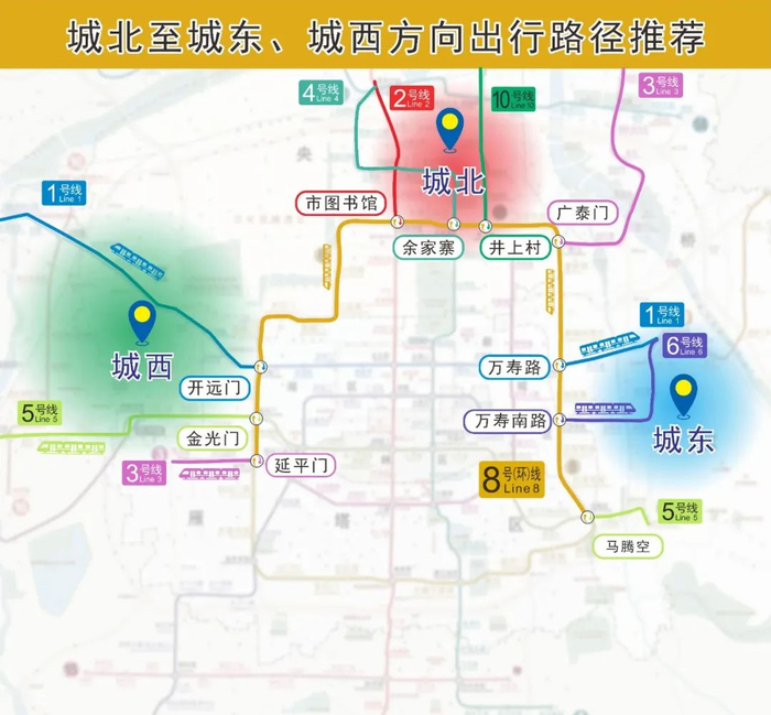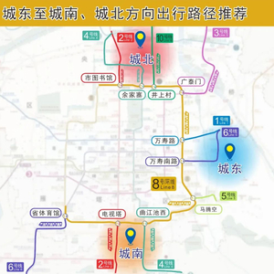 四是城北至城东、城西方向出行路径推荐:以前由城北方向经2号线北大街站、4号线五路口站换乘至城东、城西方向的市民,现在可选择在2号线市图书馆站、4号线余家寨站换乘8号(环)线前往。